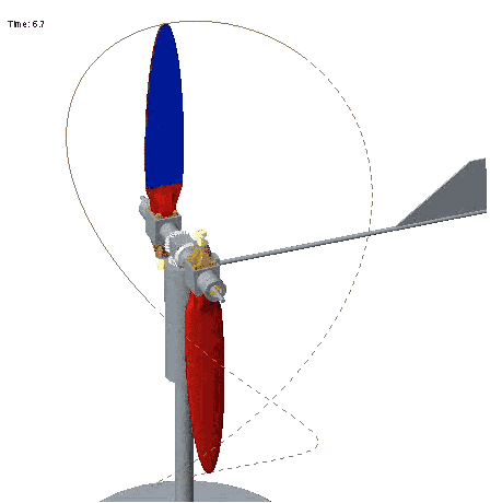 In this animation wind is moving parallel to the tail vane. The blue side of the vane is flat, while the red side is an airfoil, which adds lift as well as drag during part of the rotary cycle when it is moving in direction of the wind. The tip speed ratio is also greater than 1 — another indication of higher efficiency. However, with two blades the upstream side of the cycle does not extract energy from half of the turbine’s swept area, reducing efficiency. Thus four blades maybe preferred.